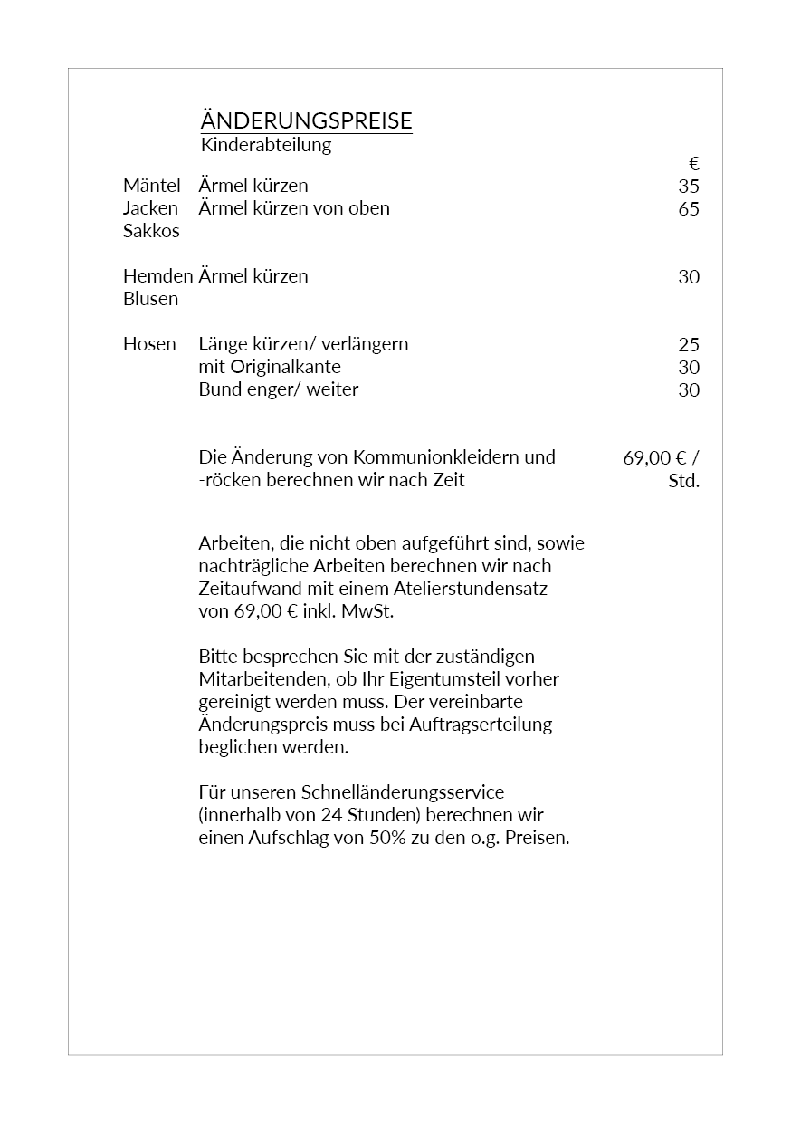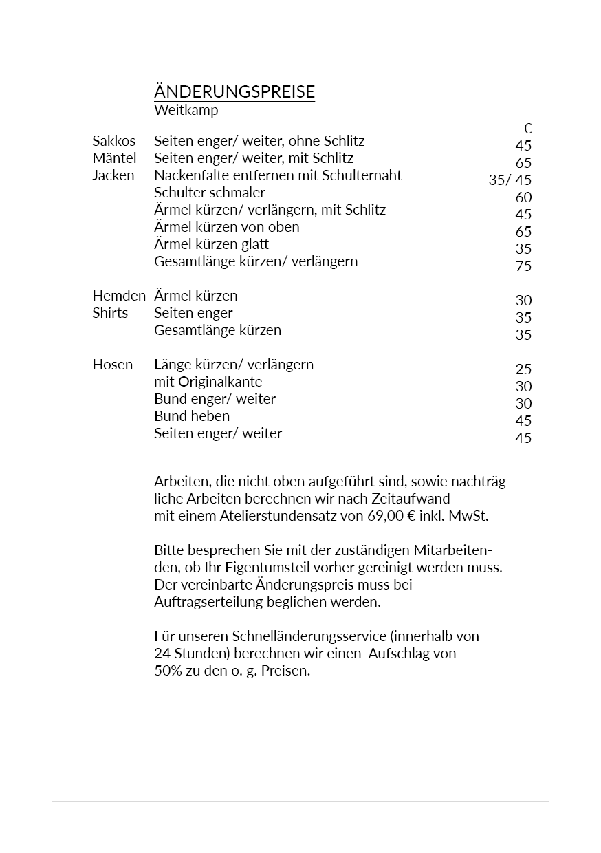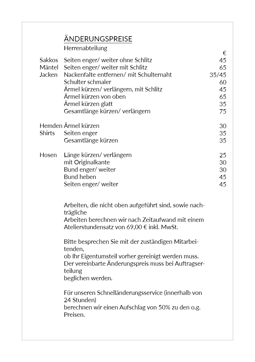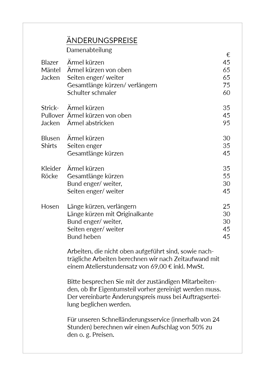 Manchmal fehlt nur ein kleiner Handgriff zum perfekten Sitz – und genau dafür ist unser Atelier da. Damit Sie vorab wissen, mit welchen Kosten Sie rechnen können, finden Sie hier eine Übersicht unserer gängigen Änderungsleistungen